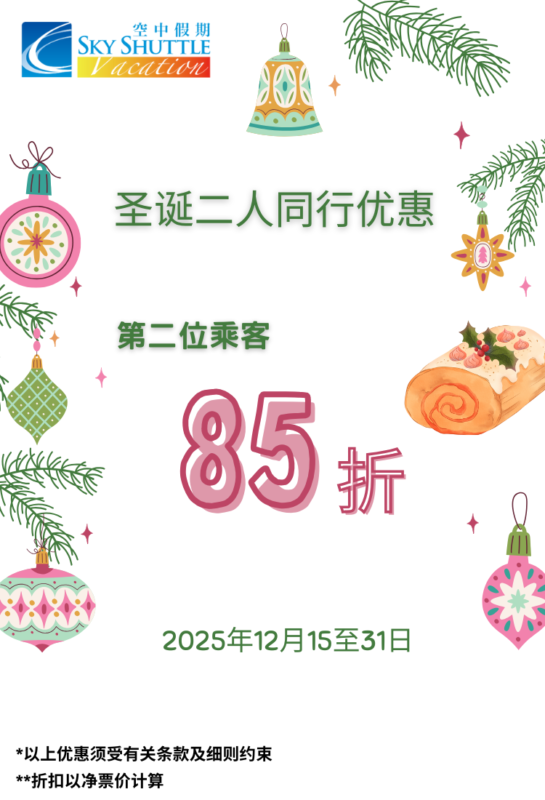 两人同行,第二人可享净票价85折优惠(适用于所有旅客)